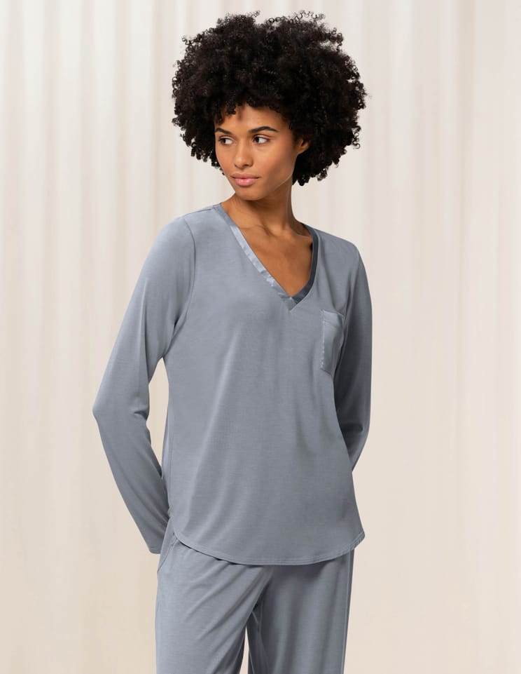 Dobre samopoczucie jest dla nas priorytetem. Dlatego właśnie zaprojektowaliśmy tę górę od piżamy z materiału z aloesem, który poprawia jakość snu. Właściwości regulacji temperatury zapewnią chłód i wygodę podczas snu.